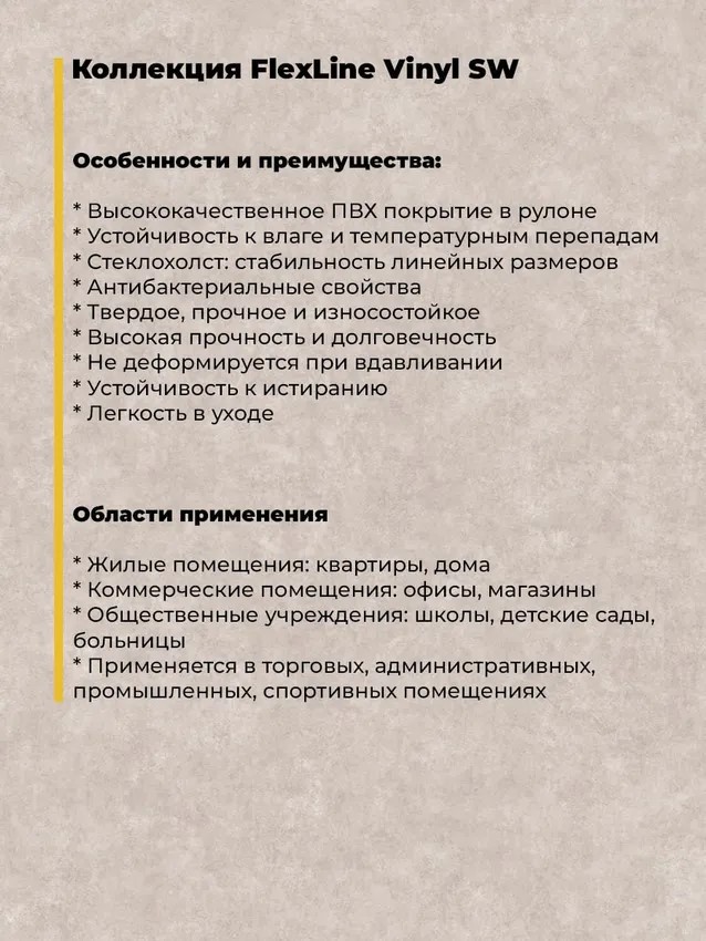 Линолеум Comitex Flex Line — это высококачественное ПВХ покрытие, идеально подходящее для различных типов помещений. Продукция компании Комитекс Лин отличается долговечностью, эстетической привлекательностью и удобством в эксплуатации. Покрытие Flex Line от Comitex предлагает множество преимуществ, которые делают его популярным выбором для потребителей:Высокая прочность и долговечность: Благодаря применению современных технологий и высококачественных материалов, это покрытие способно выдерживать значительные нагрузки и надолго сохранять свой первоначальный вид.Антибактериальные свойства: Специальный защитный слой обеспечивает защиту от микробов и бактерий, что делает его идеальным для использования в местах с высокими требованиями к гигиене.Устойчивость к влаге и температурным перепадам: Покрытие сохраняет свои свойства и внешний вид даже при высоких уровнях влажности и значительных температурных колебаниях.Легкость в уходе: Материал не требует специального ухода, легко чистится и устойчив к загрязнениям. Comitex Flex Line отличается уникальной комбинацией прочности, устойчивости к истиранию и эстетической привлекательности. Благодаря этим свойствам оно широко используется как в жилых, так и в коммерческих помещениях.
