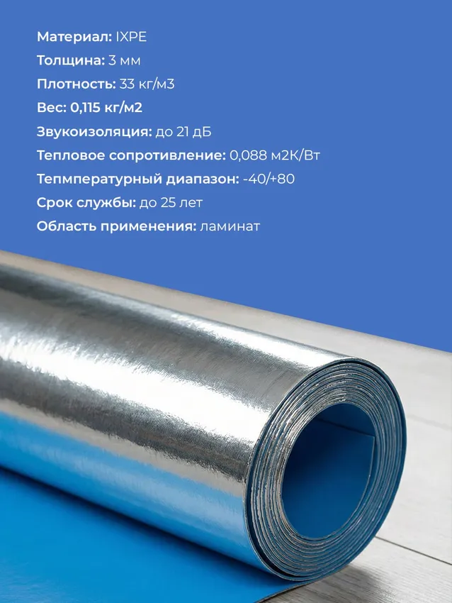 Подложка IXPE 3 мм с фольгированным слоем, влагостойкая под ламинат 11 м2